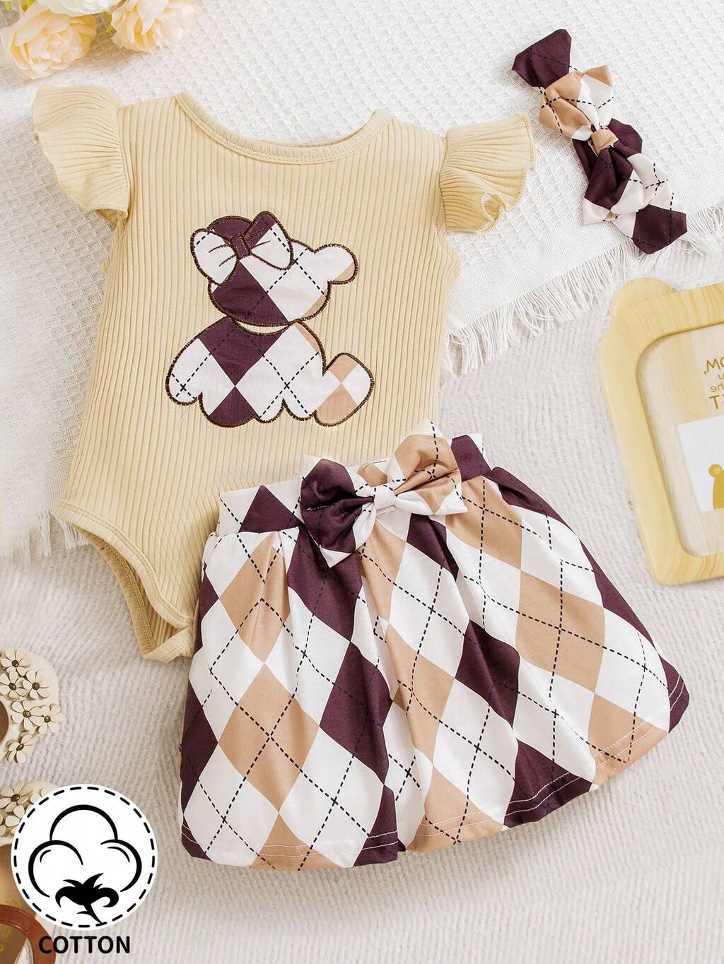 Baby Girl Cartoon Plaid Print Bodysuit With Flounce Sleeve And Skirt Set