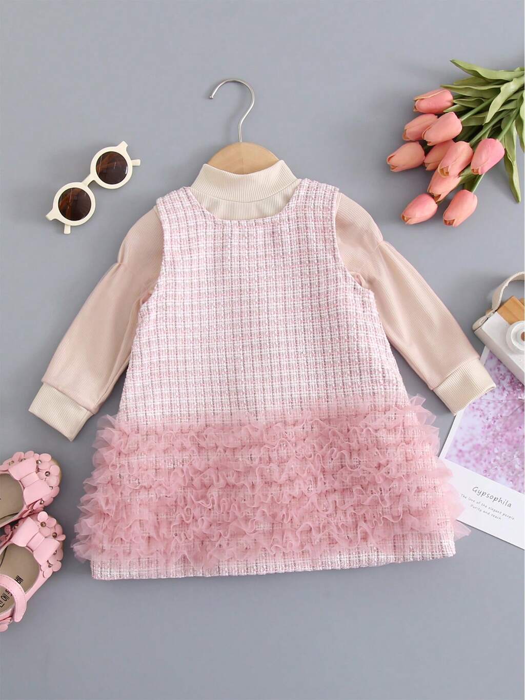 Baby Girl Mock Neck Tee & Plaid Mesh Ruffle Trim Dress