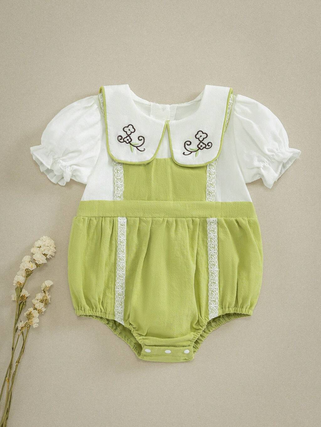 Baby Girl Summer Solid Color Stitching Embroidered Mesh Peter Pan Collar Short Puffed Sleeve Cute Bodysuit