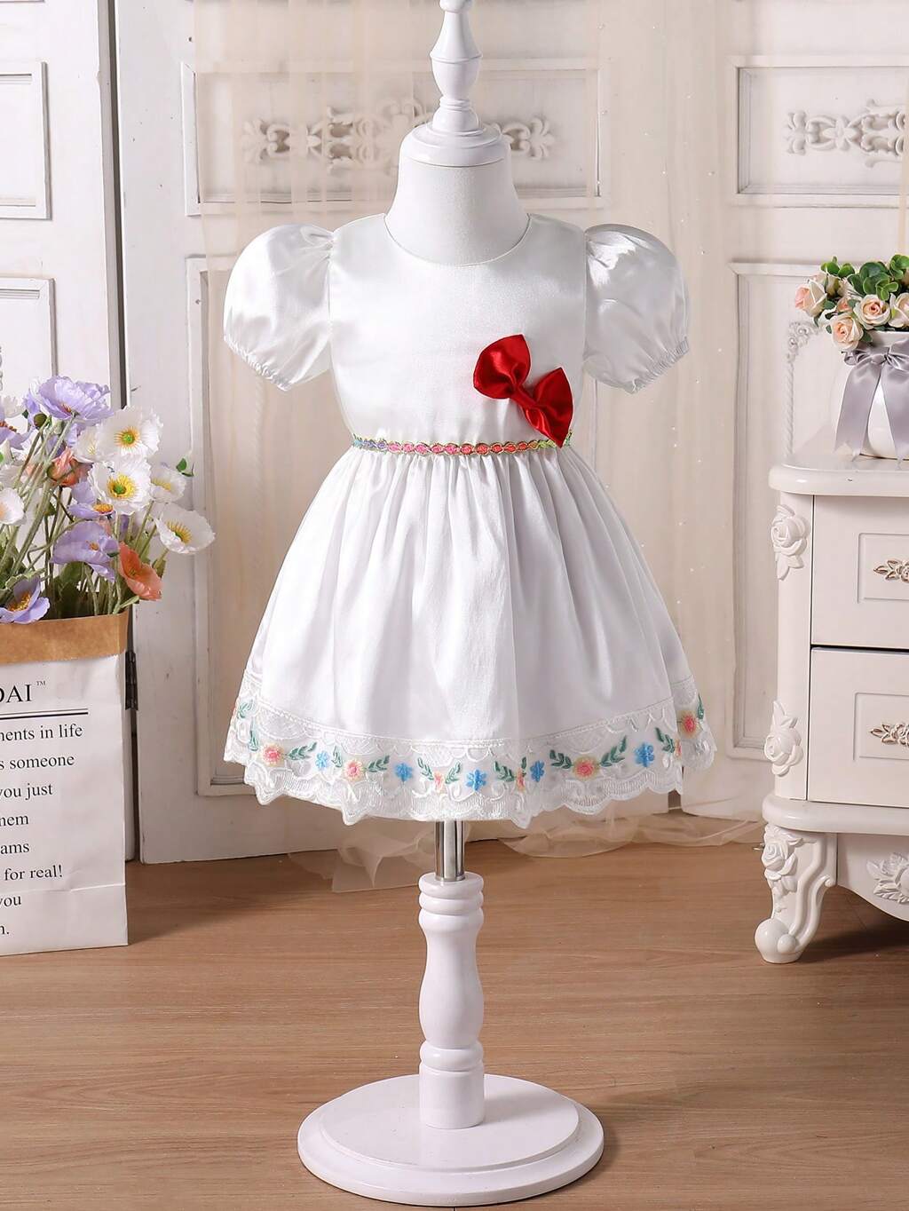 Baby Girl White Round-Necked Organza Patchwork Dress With Bow-Knot Decoration, Flower Embroidery And Tulle Dress