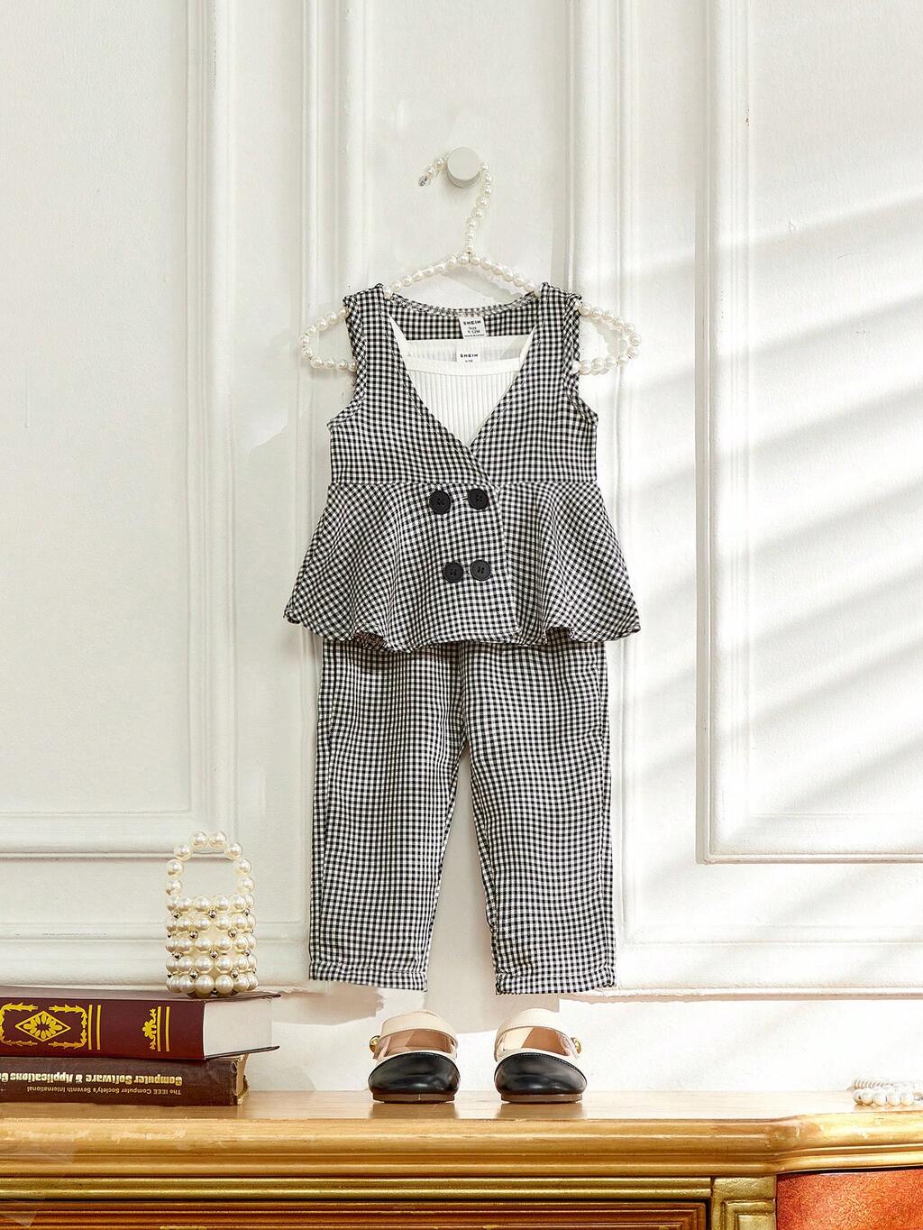 Baby Girl Plaid Double Breasted Sleeveless Top And Long Pants Set
