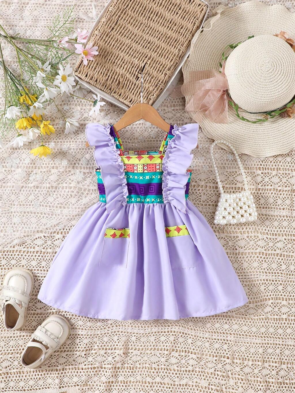 Baby Girls' Printed Patchwork Ruffle Edge Romper Dress For Summer