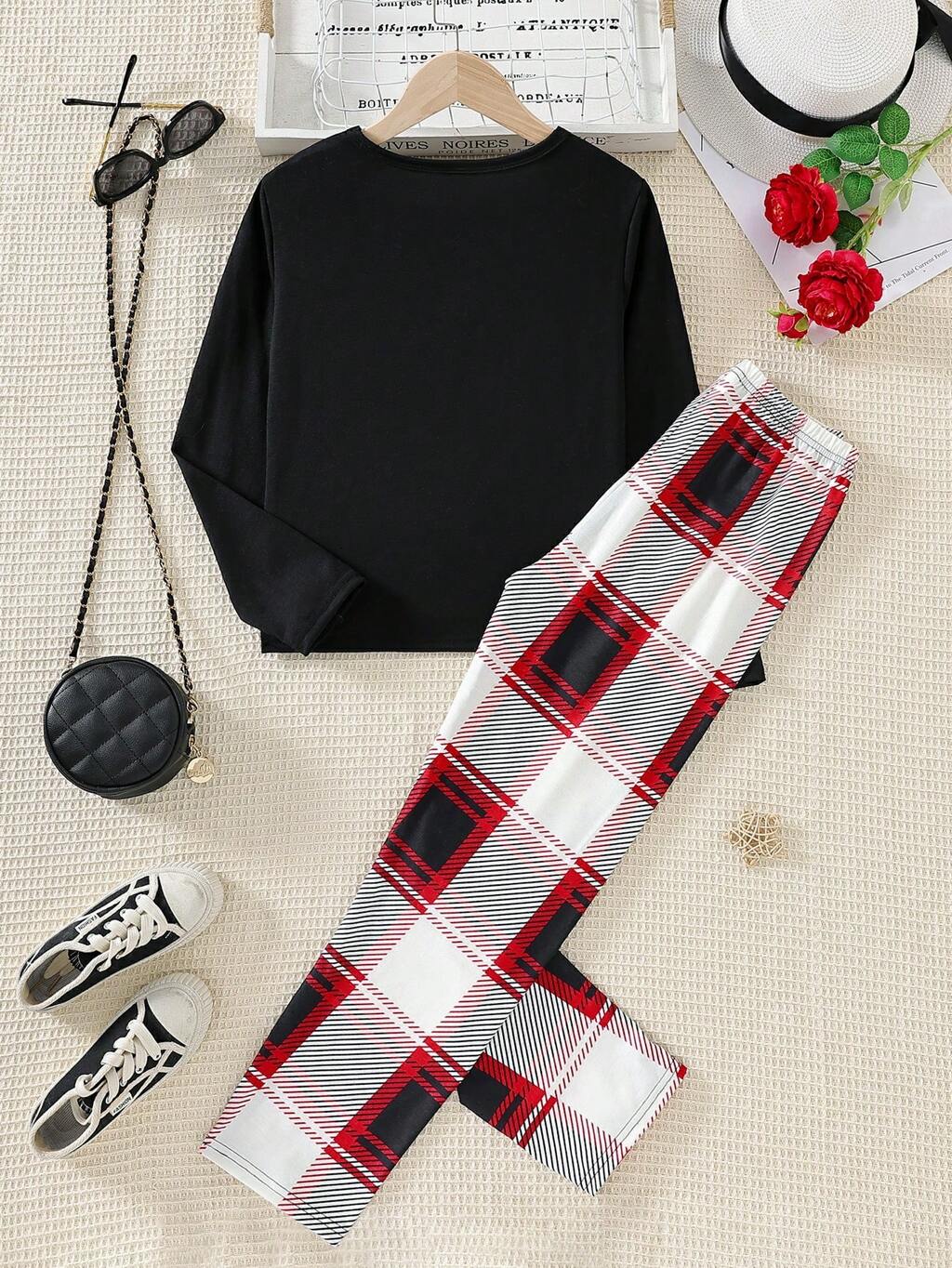 Tween Girl's Solid Color Long-Sleeved Top And Plaid Trousers Two-Piece Home Wear Set