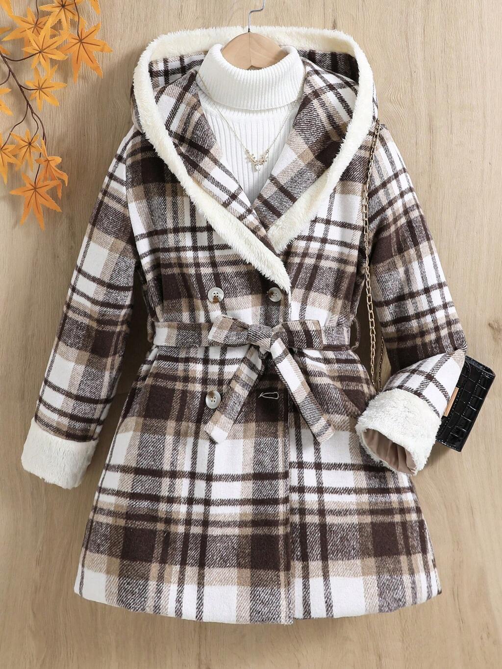 Tween Girl 1pc Plaid Print Double Breasted Hooded Belted Overcoat