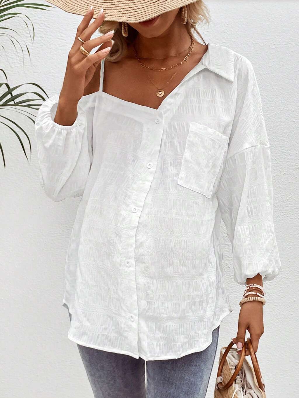 Maternity Solid Color Button-front Casual Shirt