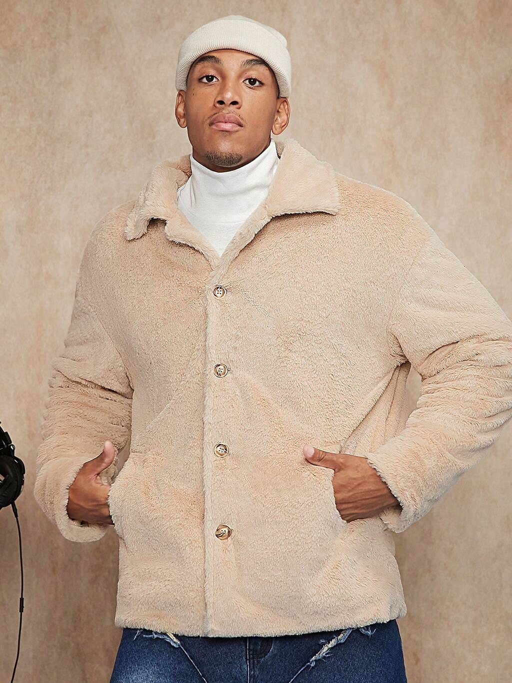 Loose Fit Men's Slant Pocket Drop Shoulder Teddy Jacket