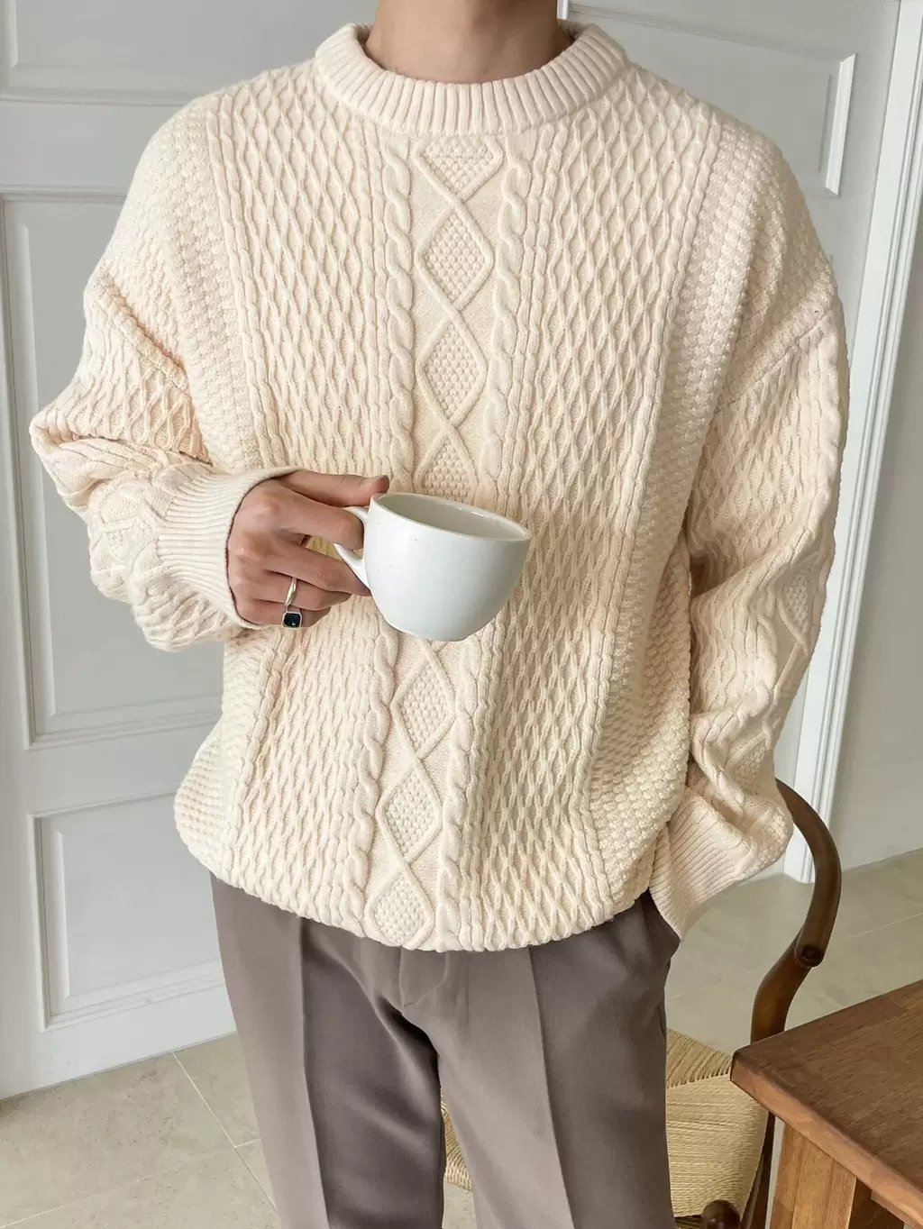 Men Cable Knit Drop Shoulder Fall Beige Sweater