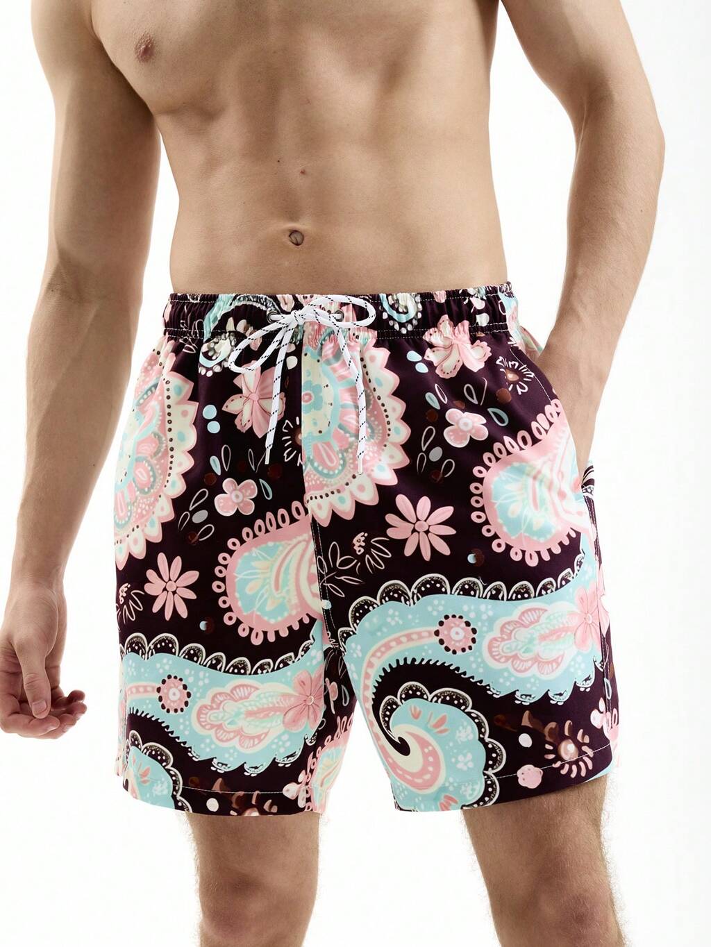Men Casual Beach Shorts With PPaisley Print, Elastic Drawstring Waist And Loose Fit
