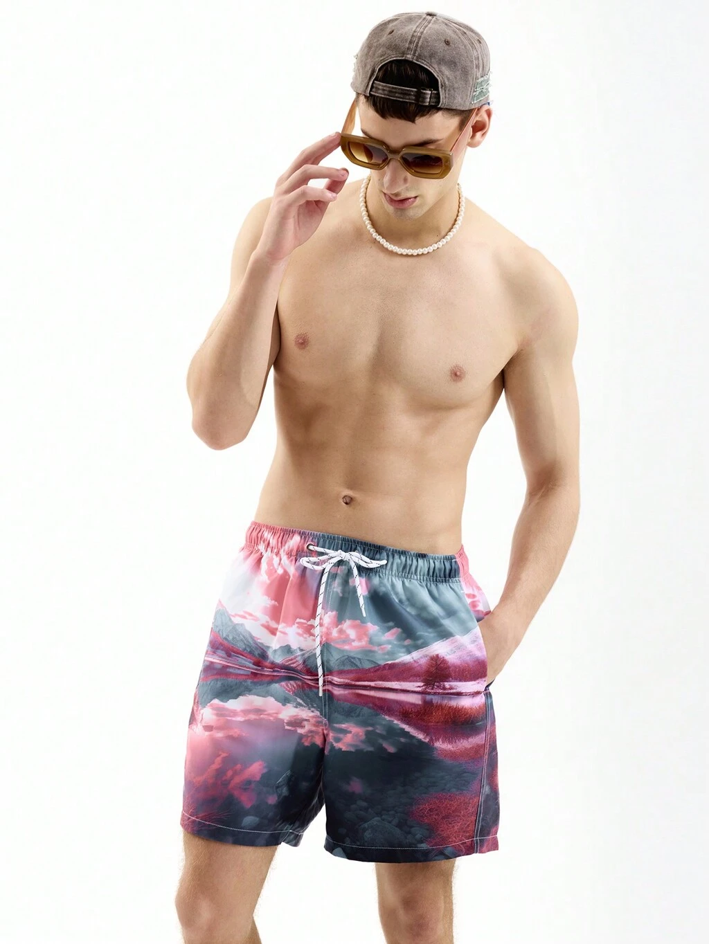 Men's Loose Landscape Printed Beach Shorts, Vacation Style
