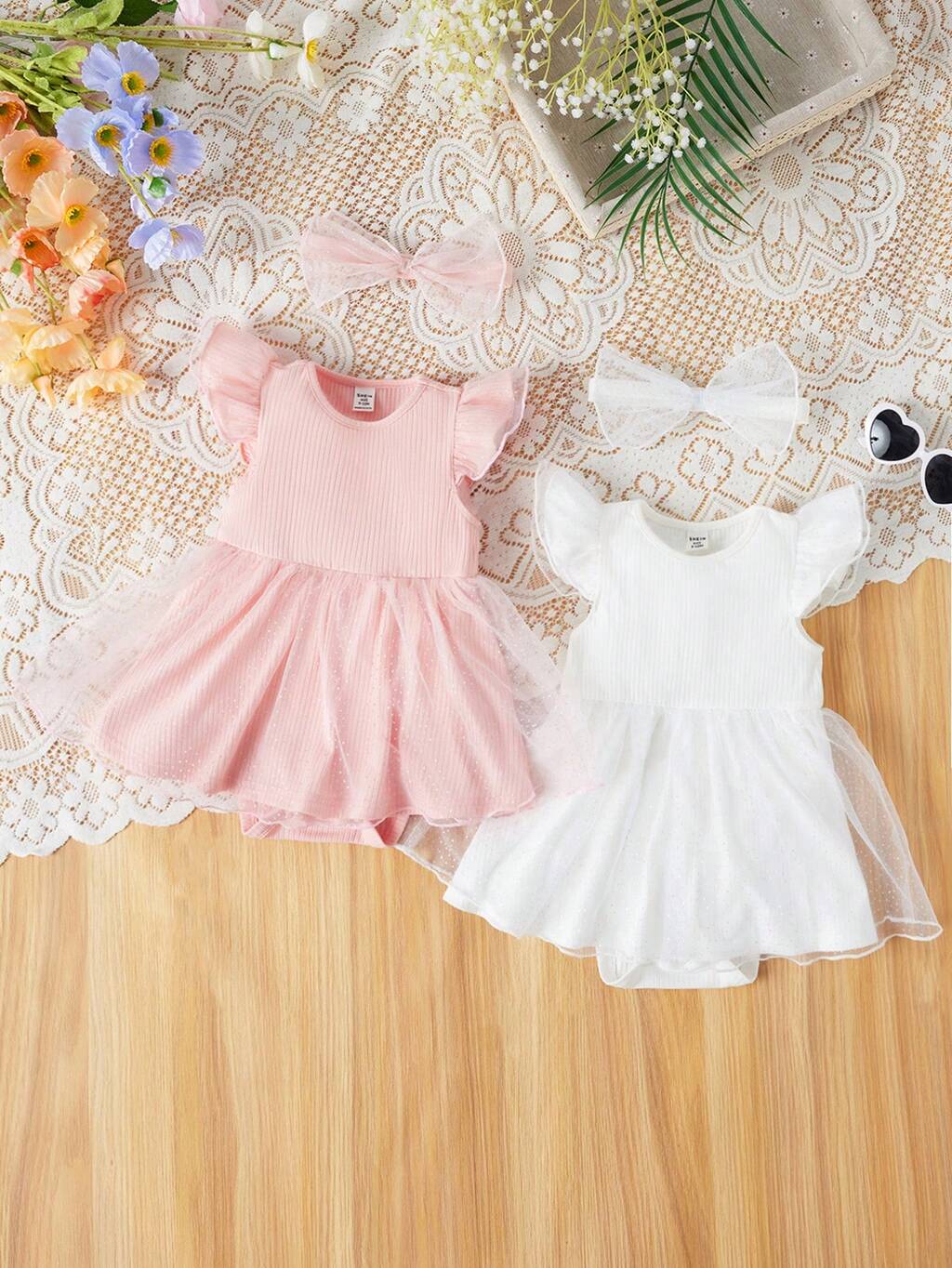 Baby Girls' Leisure Knitted Plain Mesh Panel Open Crotch Bodysuit With Headband 4pcs Set