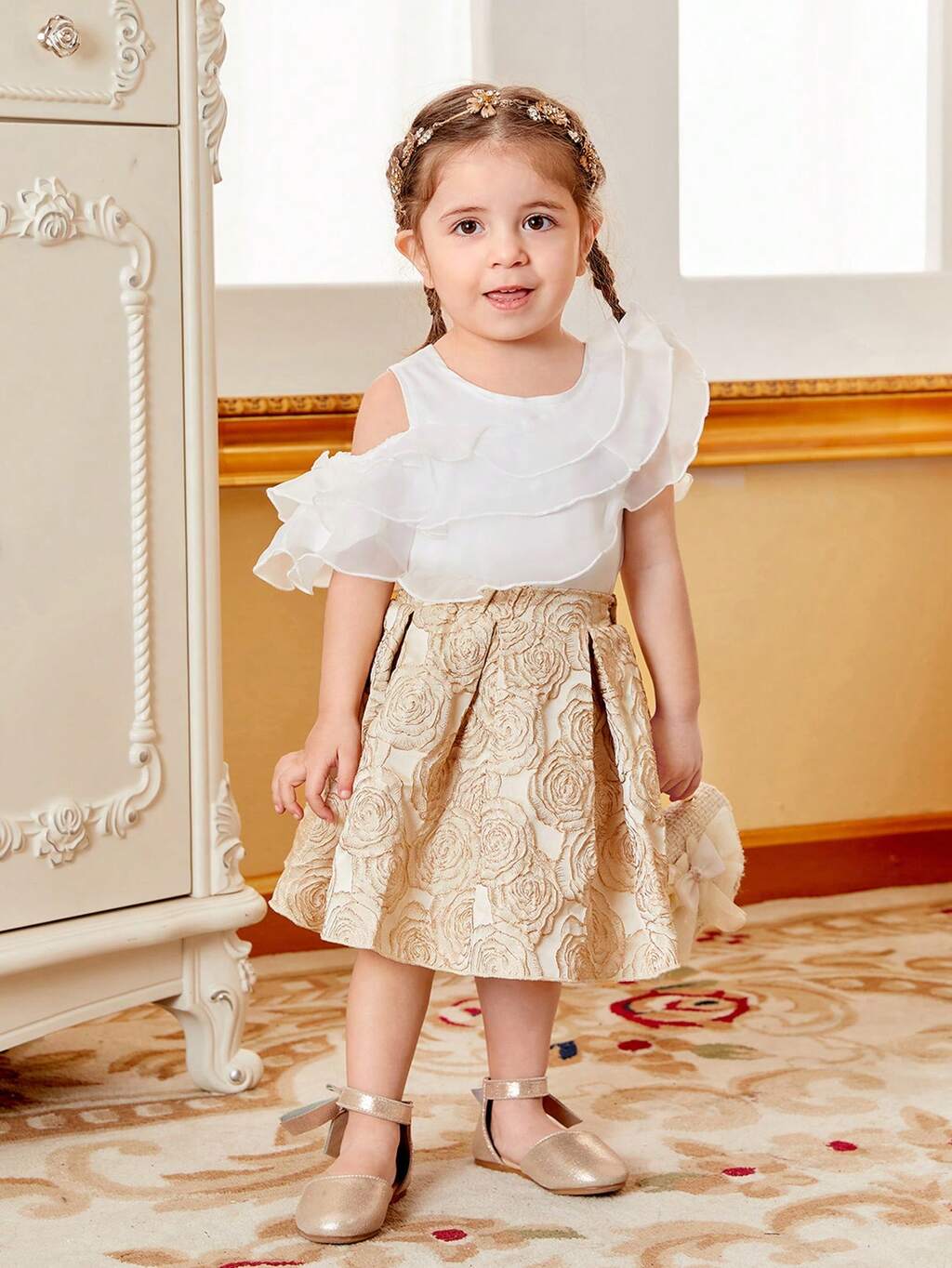 Baby Girl Gorgeous Short Sleeve Dress With Gold Foil Floral Print And Ruffled Hem