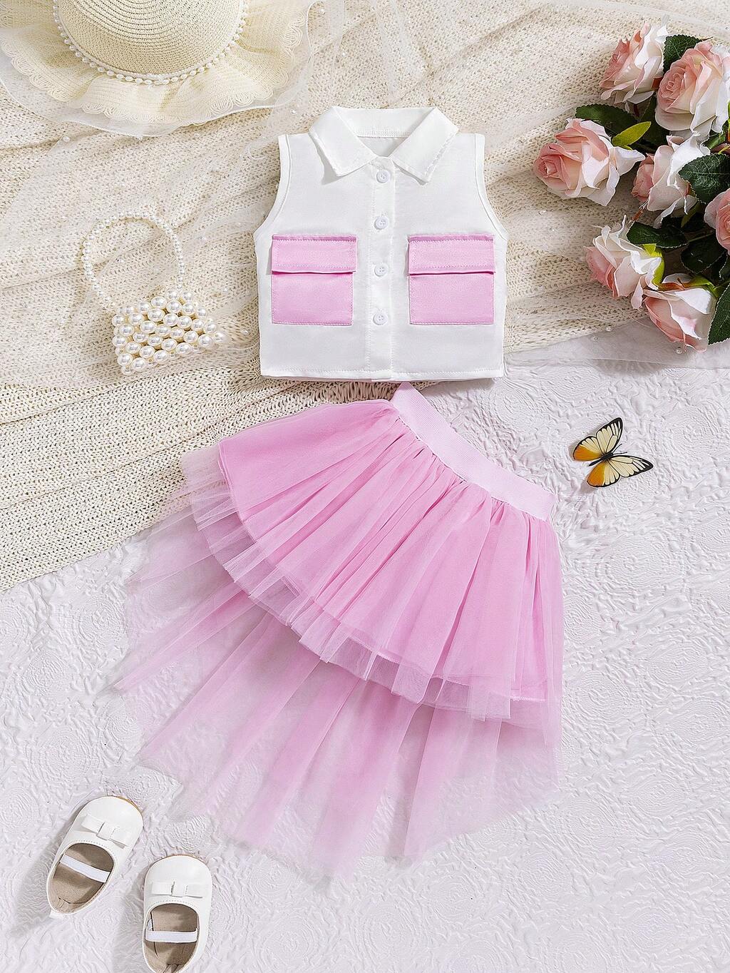 Baby Girl Elegant, And Cute White & Pink Mesh Contrast Top, Suitable For Daily Wear, Leisure, Parties And Festivals