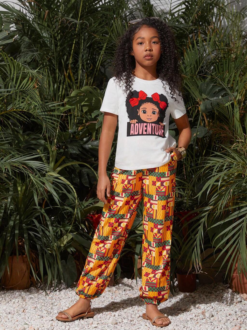 Tween Girls' Daily Casual Short Sleeve Character Printed Round Neck Top And Printed Full Length Pants Set, Spring & Summer