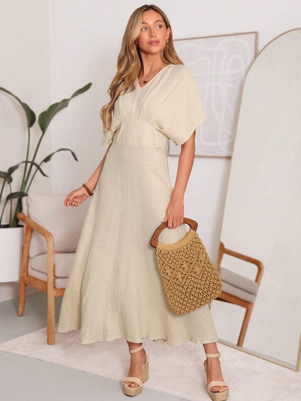 Spring And Summer Casual Texture Pleated A-Line Dress With Cinching Waist, Great For Holiday And Fashionable Look Women Dress