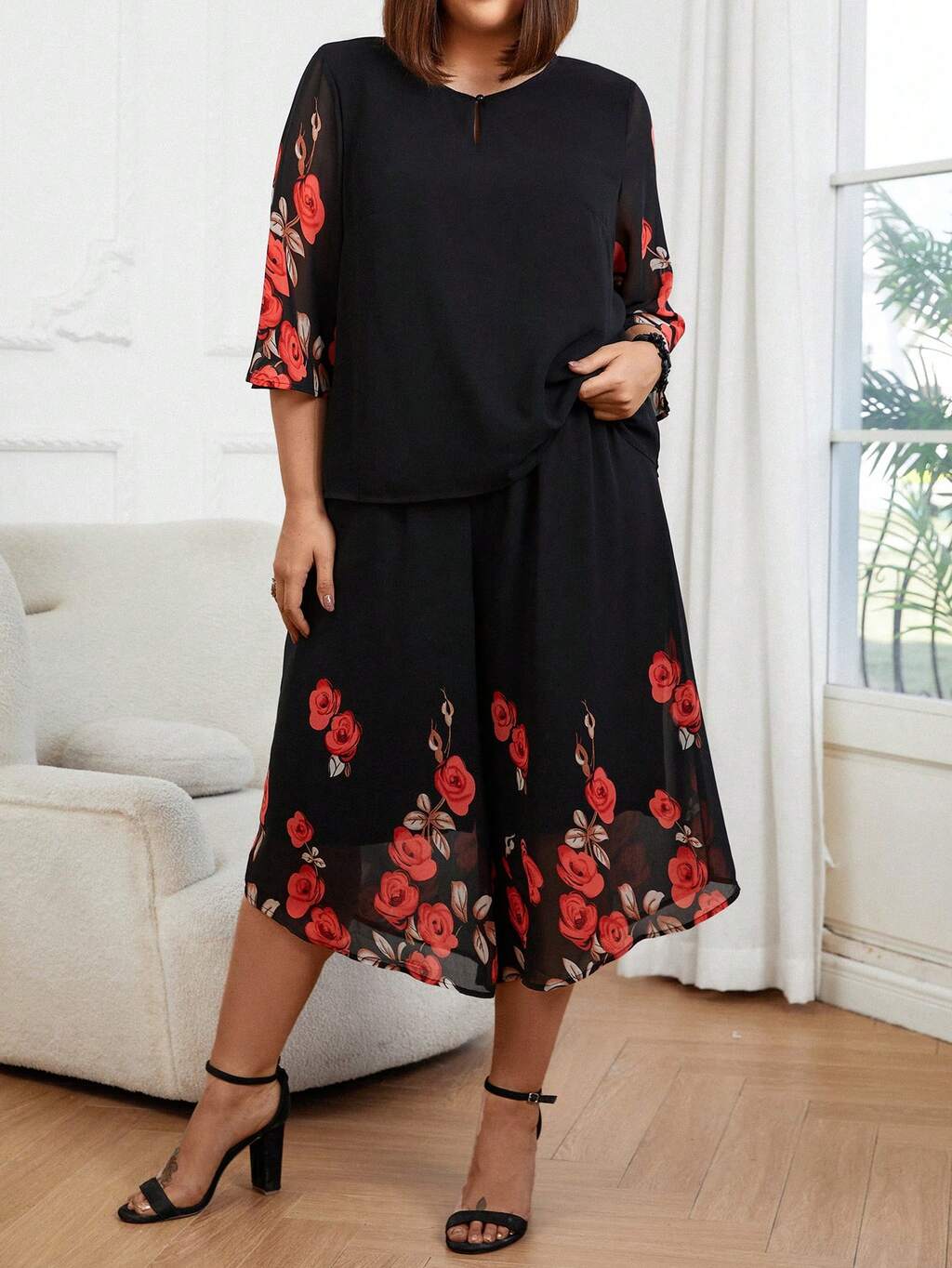 Plus Size Women's Floral Print Puff Sleeve Two Pieces Set 2 Pieces Set
