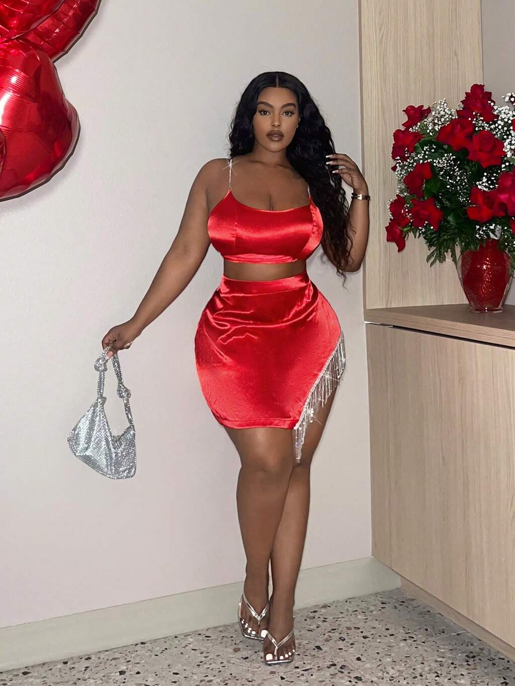 Plus Size Women's Sexy Bodycon Two-Piece Set With Chain Splicing Cami Top And Skirt