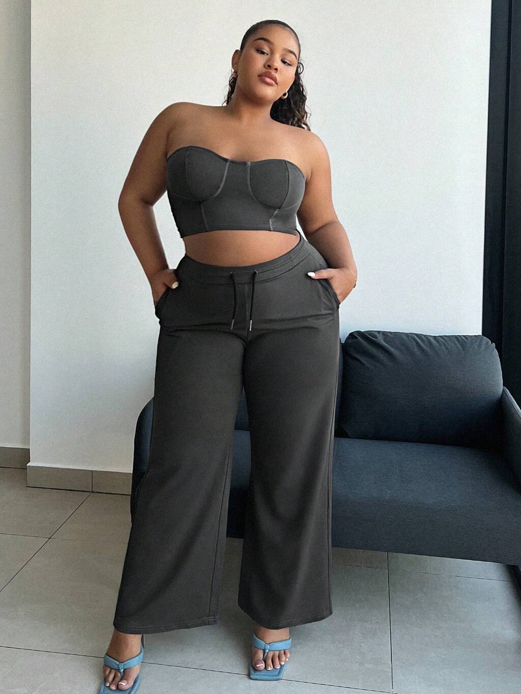 Plus Size Summer Holiday Solid Color Texture Strapless Top And Long Pants Slim Fit 2-Piece Set
