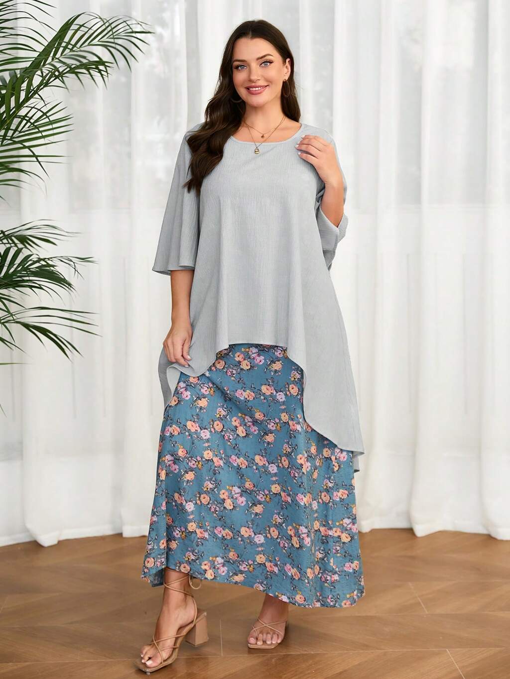 Plus Size Round Neck Solid Color Asymmetric Hem Top And Floral Print Sleeveless Dress Set 2 Pieces Set