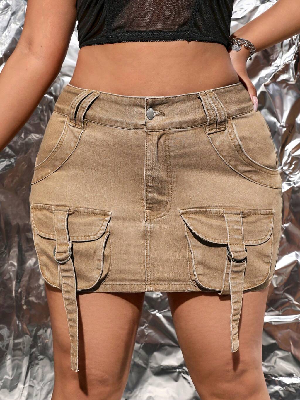 Plus Summer Flap Pocket Buckle Detail Denim Skirt