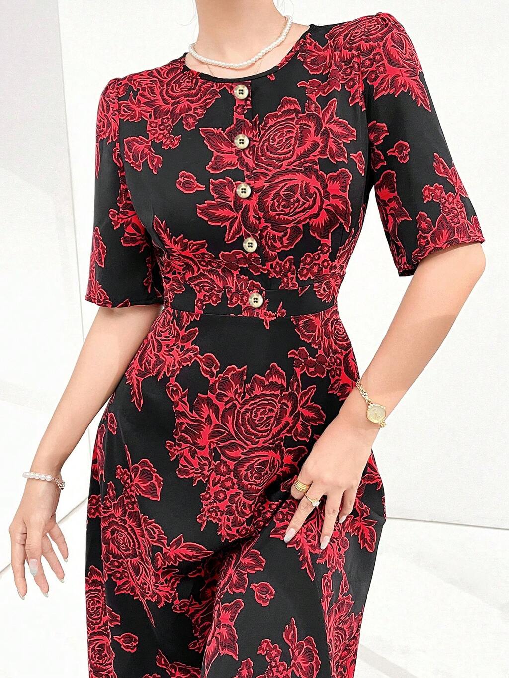 Women's Round Neck Single-Breasted Flower Printed Casual Short Sleeve Summer Dress