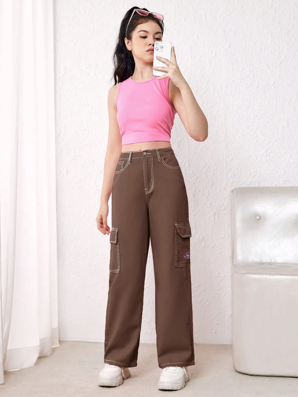 Teen Girl Letter Patched Flap Pocket Cargo Jeans