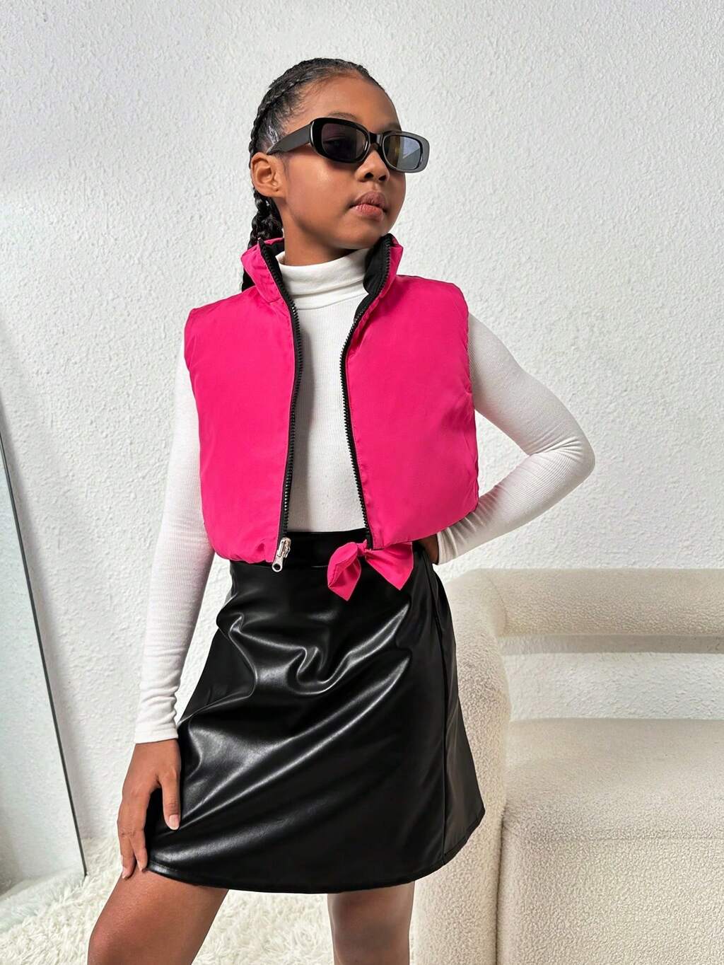 Tween Girl Zip Up Sleeveless Padded Coat & Bow Front PU Skirt
