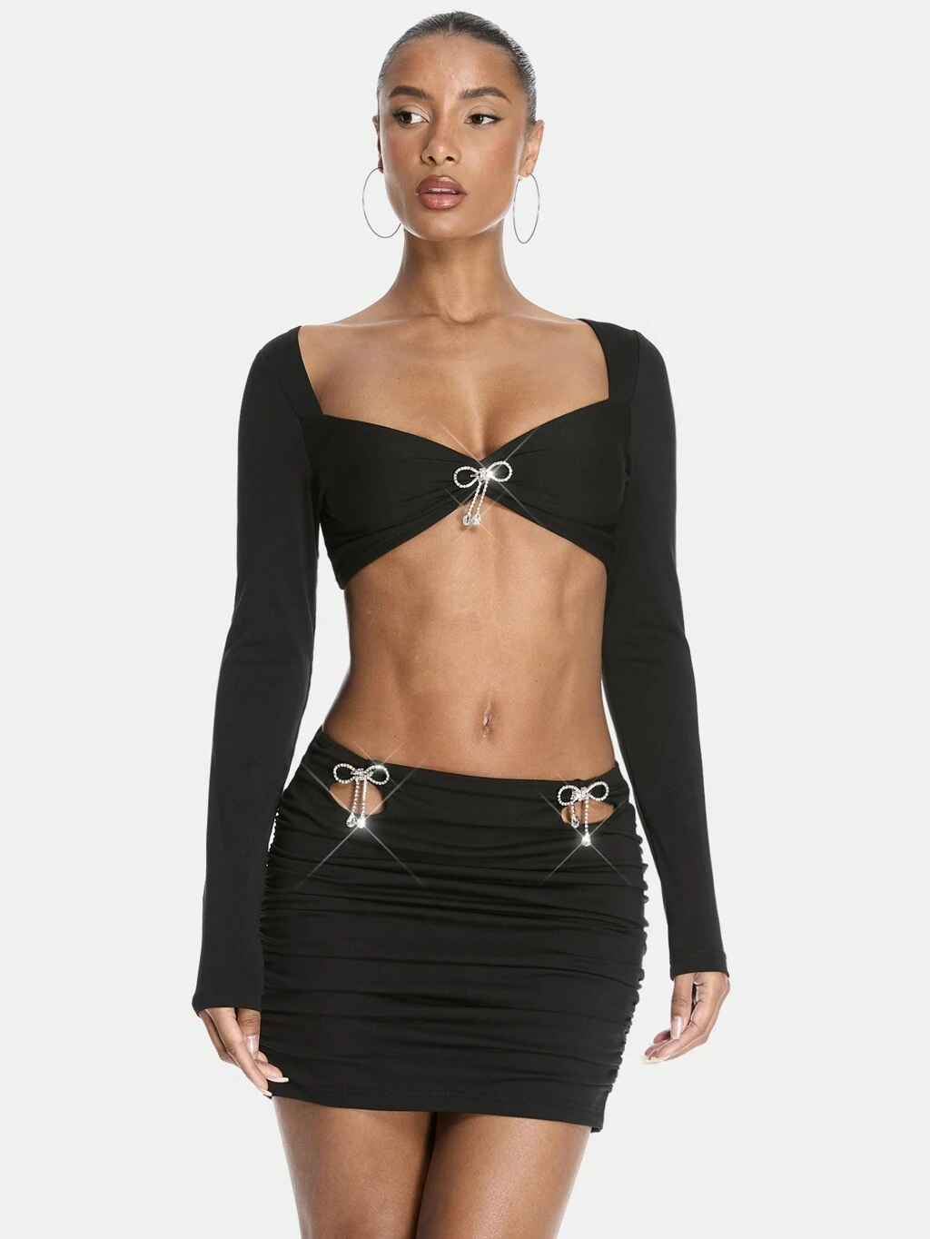 Crystal Bowknot & Rhinestone Detail Ultra Short Sleeve Top, Hollow Out, Sexy Summer Clothes, Two Pieces Skirt Set, Women's Mini Skirt Outfit, For Country Concert, Rave Festival And Concerts