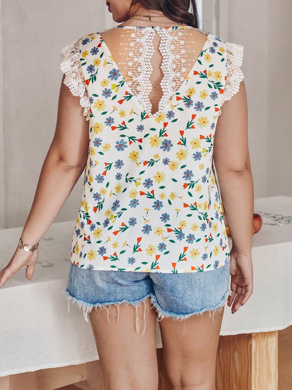 Plus Size Women's V-Neck Lace Hem Short Sleeve Floral Print Top With Flutter Sleeves