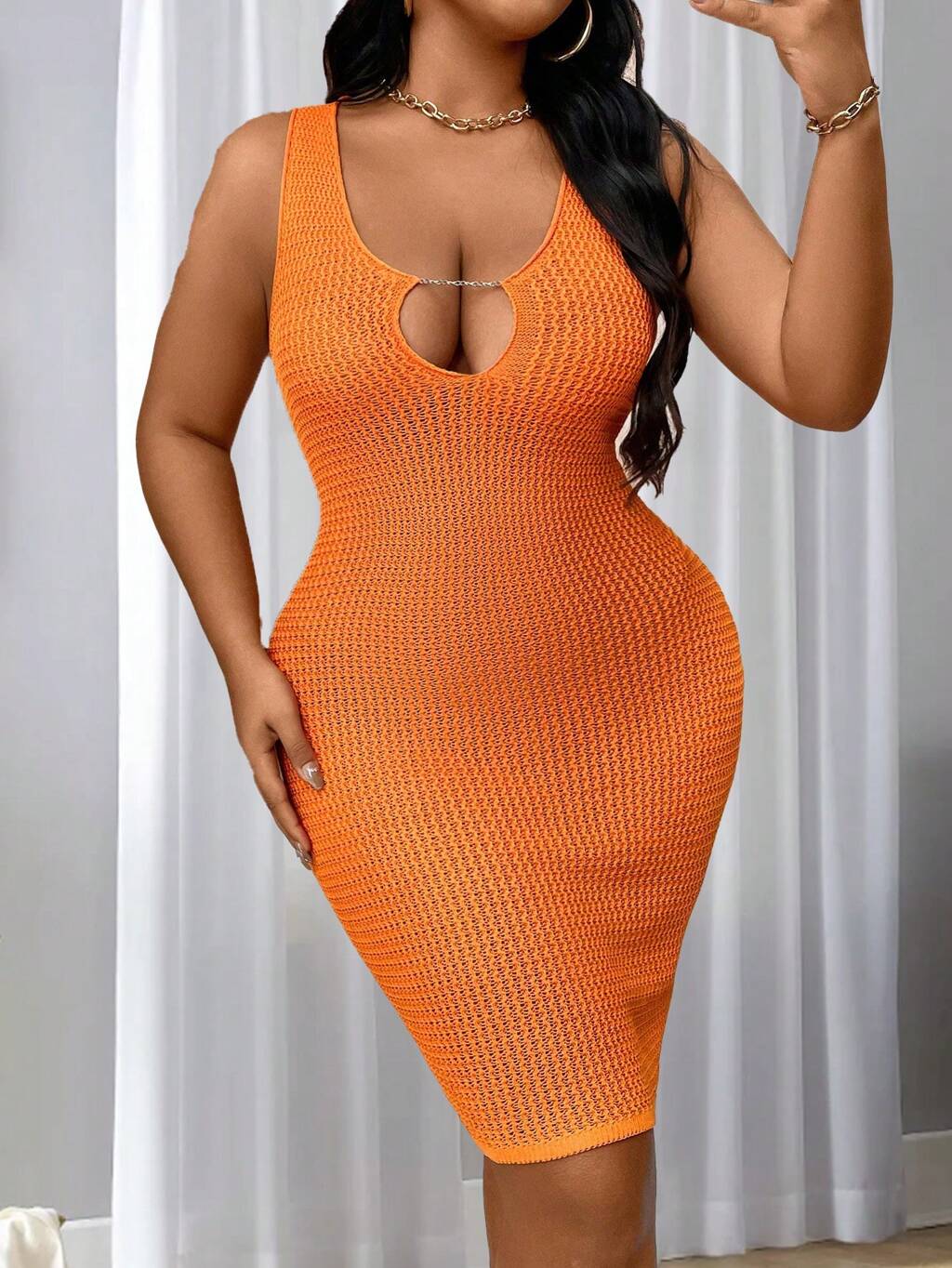 Fashionable Plus Size Women Solid Color Hollow Out Sleeveless Sweater Dress