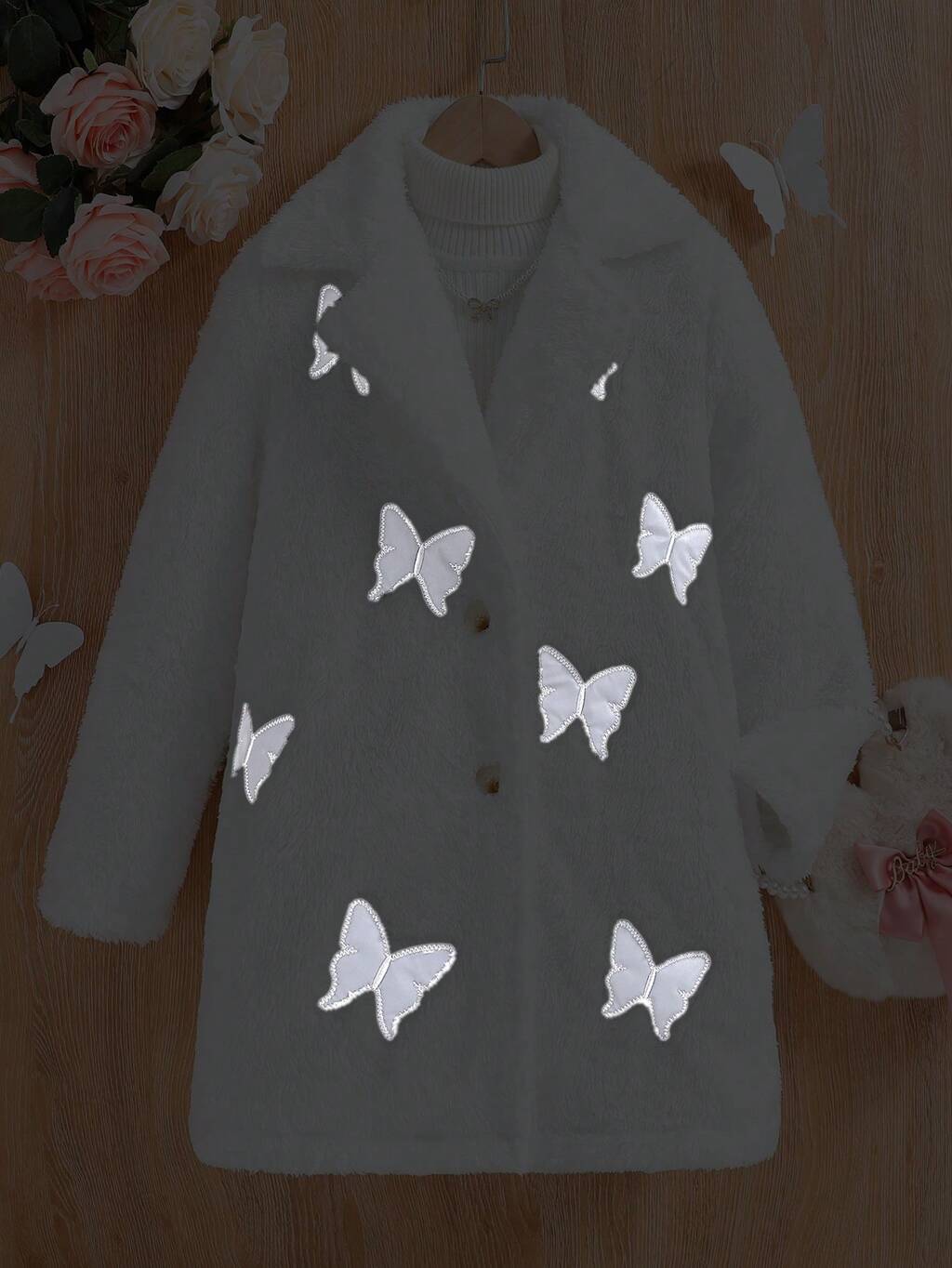 Tween Girl Reflective Butterfly Pattern Fuzzy Coat Without Sweater