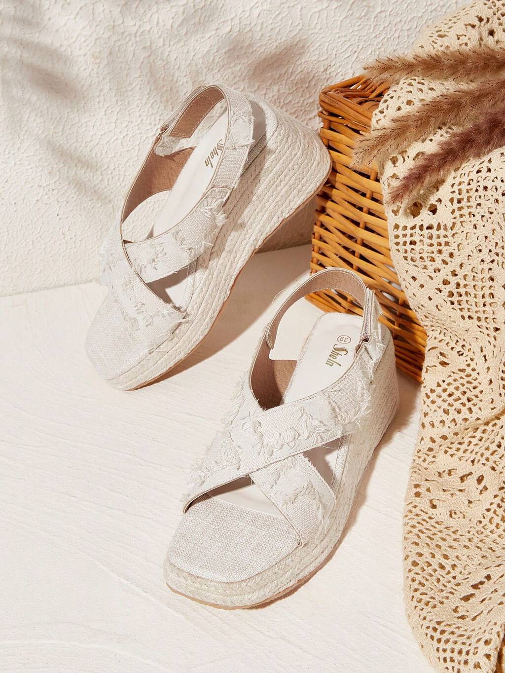 Women's Fashion Braided Simple Resort Style Espadrille Wedge Strappy White Sandals