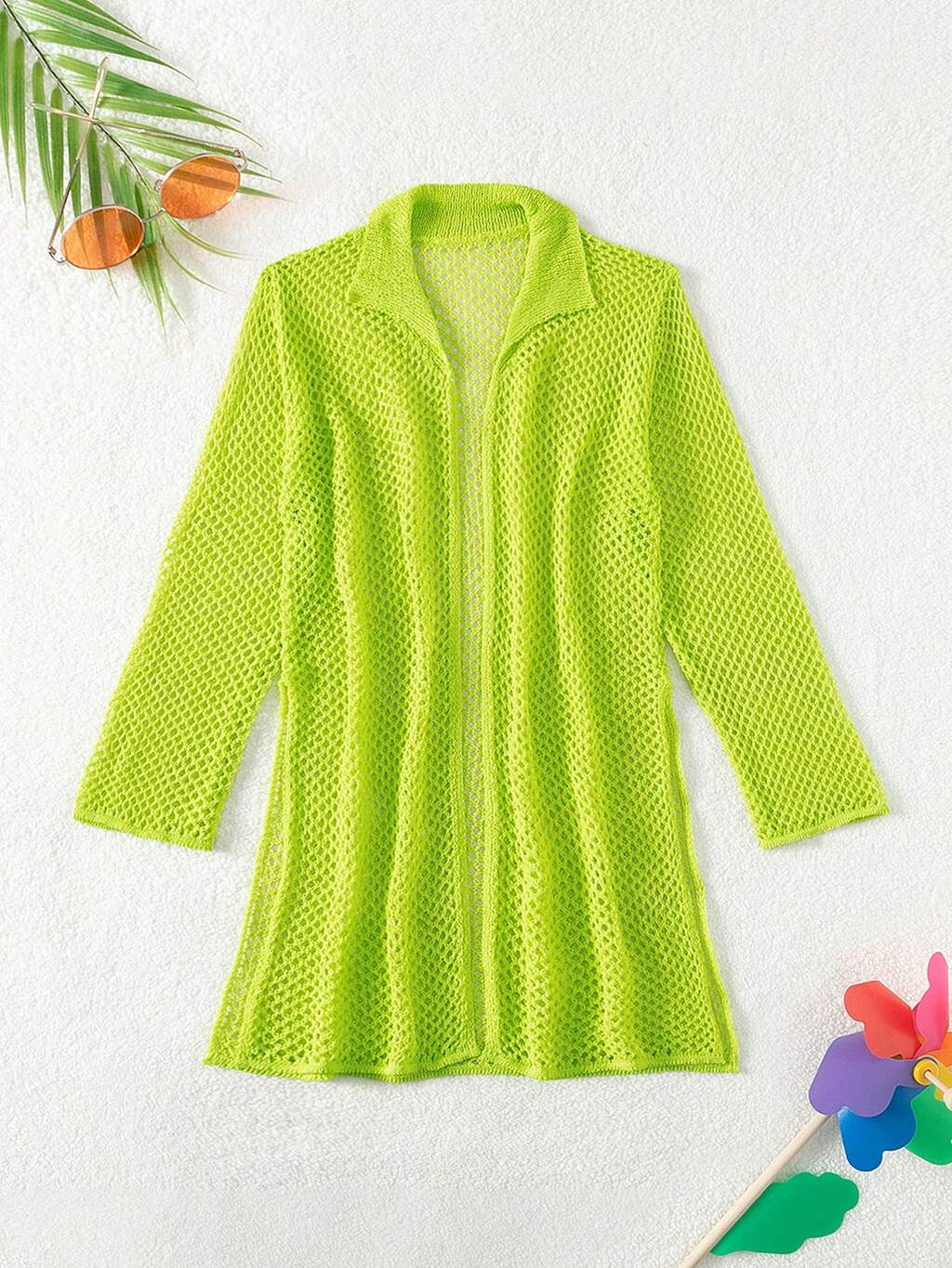 Solid Color Fishnet Split Front Open-Front Kimono For Teen Girls