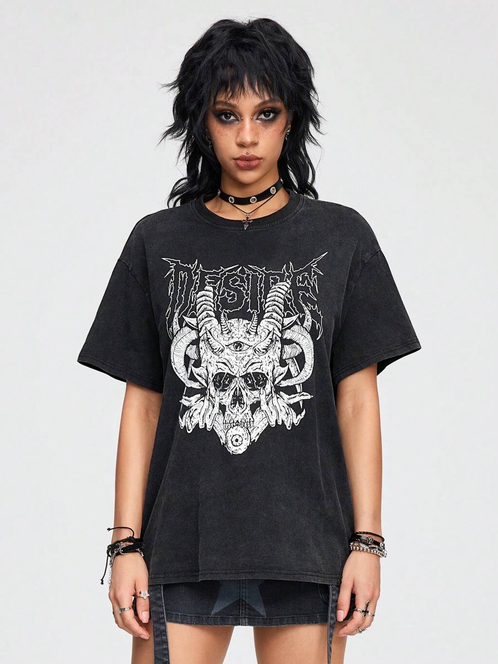 Women Loose Fit Short-Sleeved T-Shirt With Snowflake Art Joint Skull Pattern