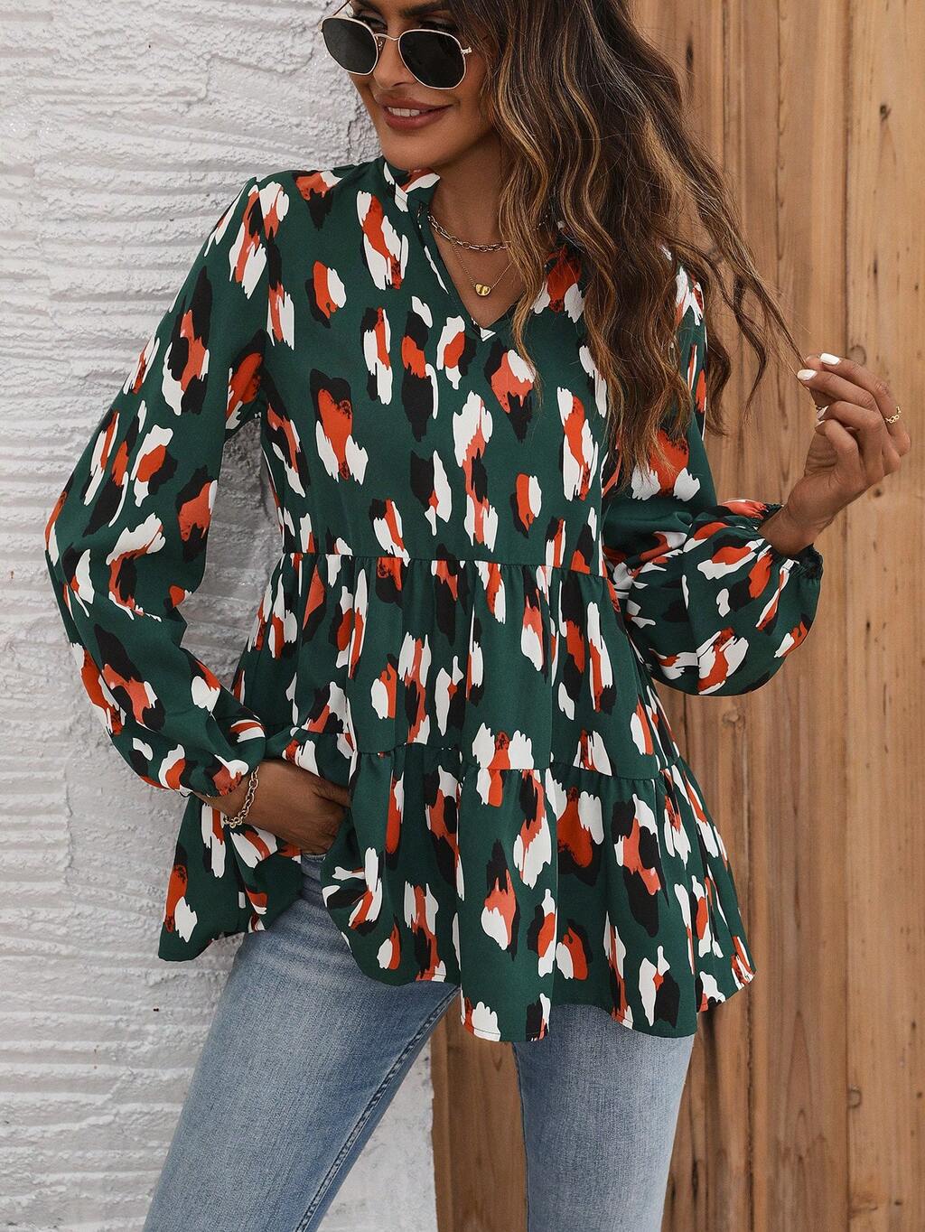 Women's Lantern Sleeve Shirt With Plant Print Fall Cloth For Women