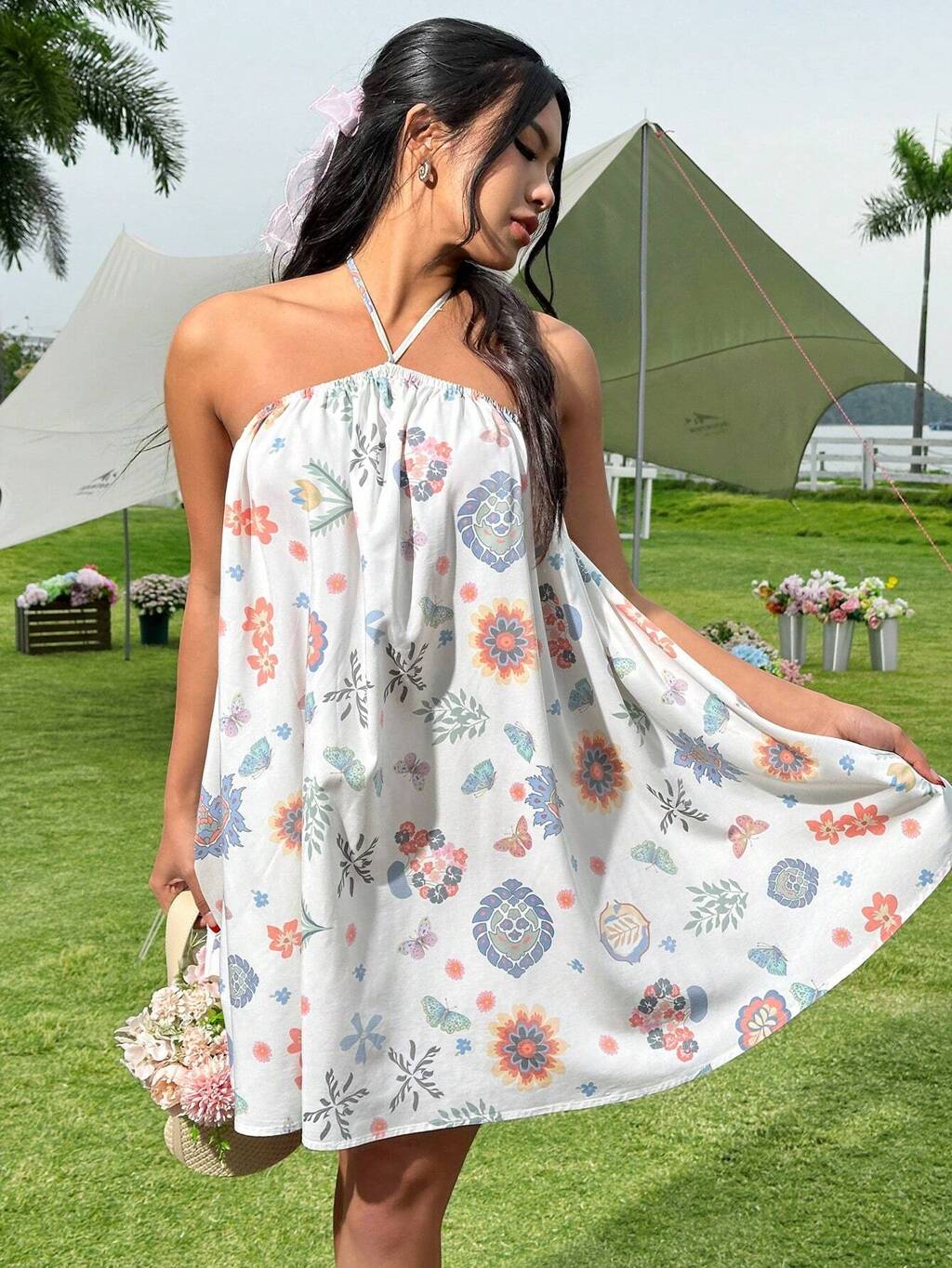 Floral Print Halter Backless Loose Dress