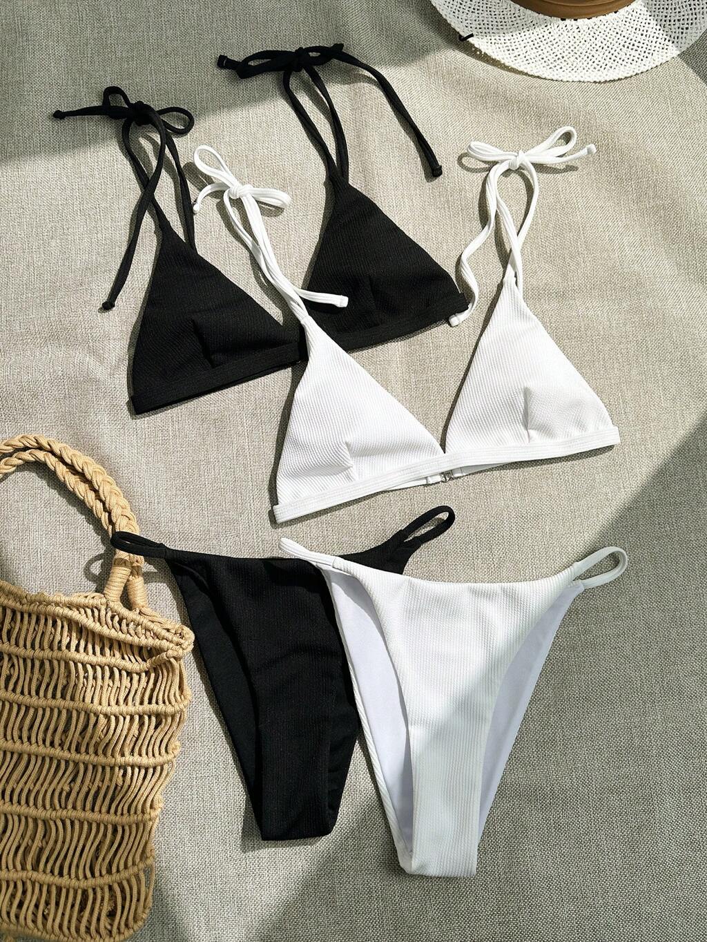 Women Solid Color Halter Neck Bikini Set With Separated Bikini Set And Micro Triangle Cut Summer Beach