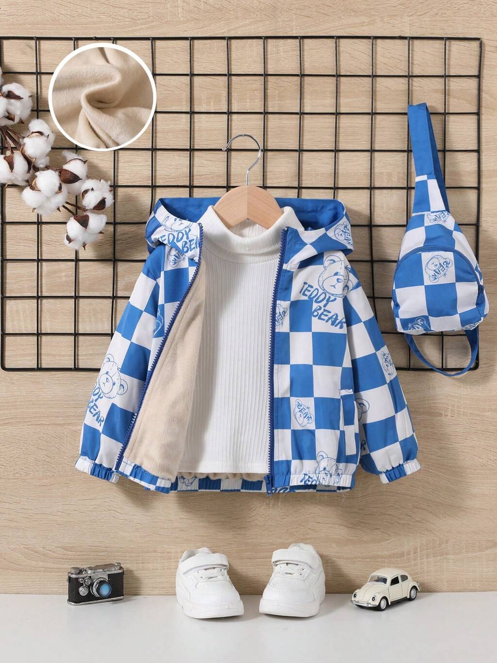 Baby Boy Checker & Letter Graphic Hooded Thermal Jacket Without Tee