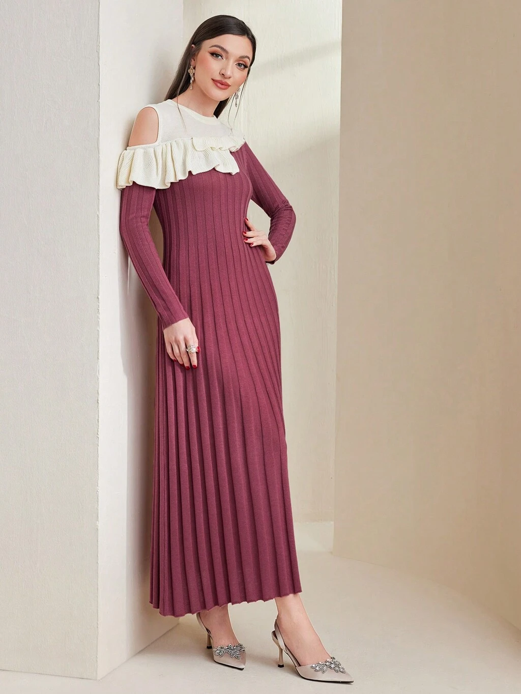 Women'S Ruffle Detail Ribbed Long Sleeve Sweater Dress