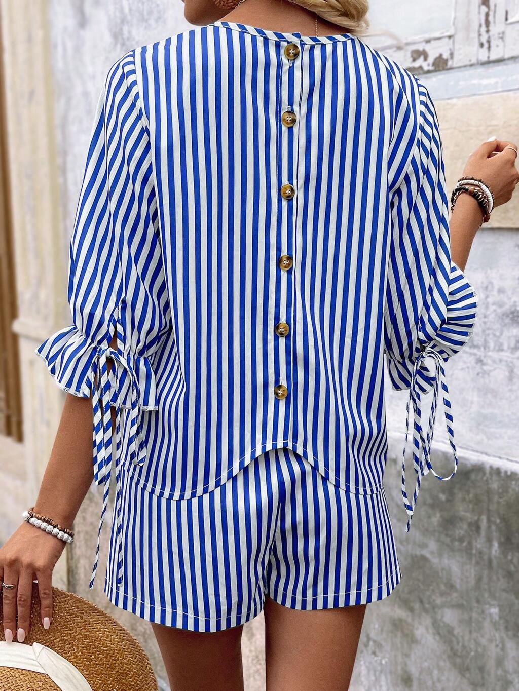 Women's Round Neck Pleated Top With Tie Back, Buckle Striped Two-Piece Set