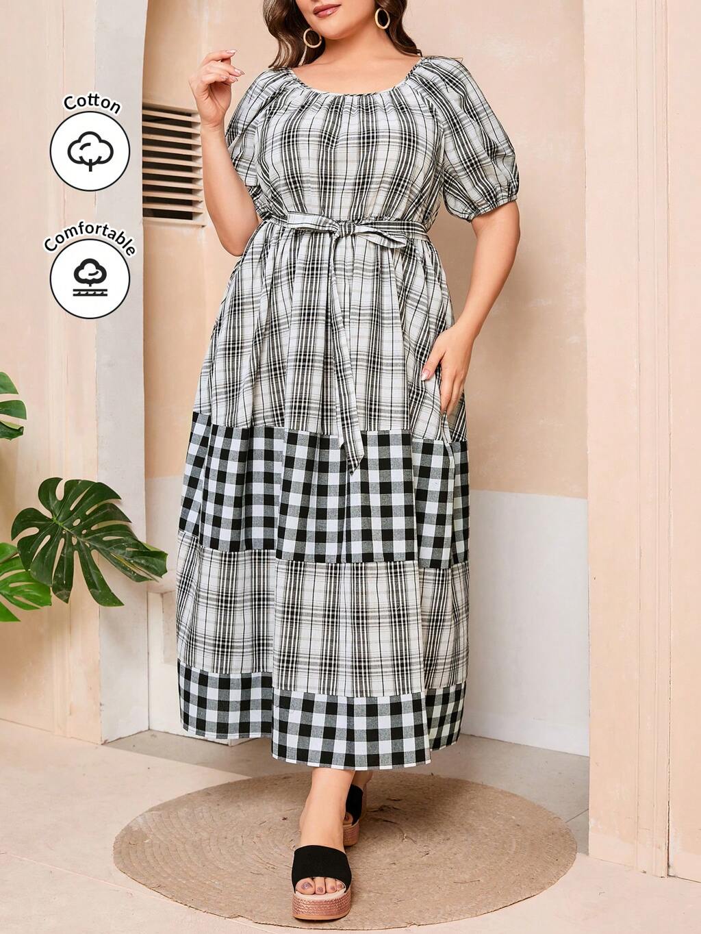 Plus Size Women's Plaid Short Sleeve Insert Shoulder Dress
