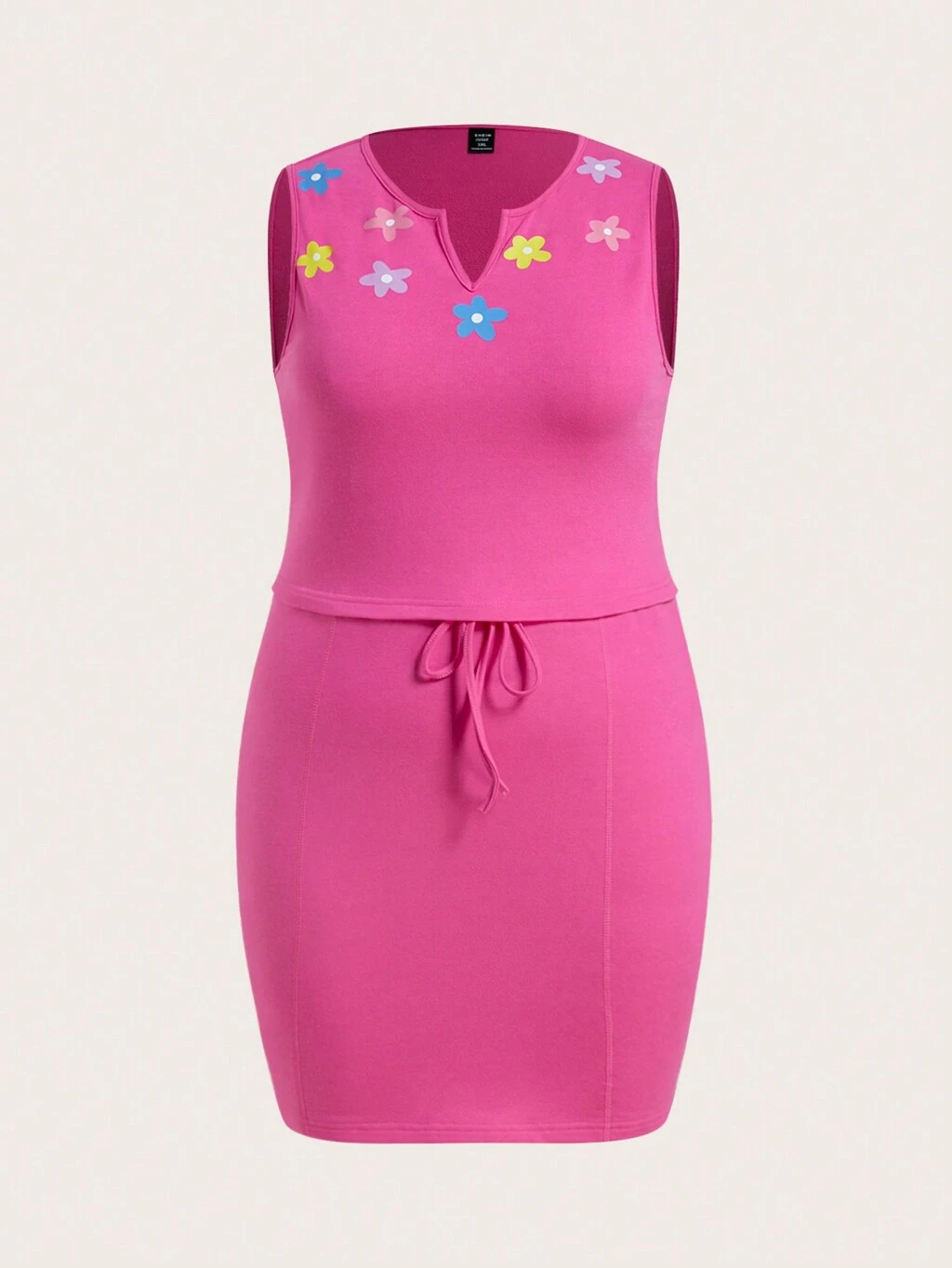 Plus Size Women's Floral Print Vest Top And A-Line Skirt Two Pieces Set