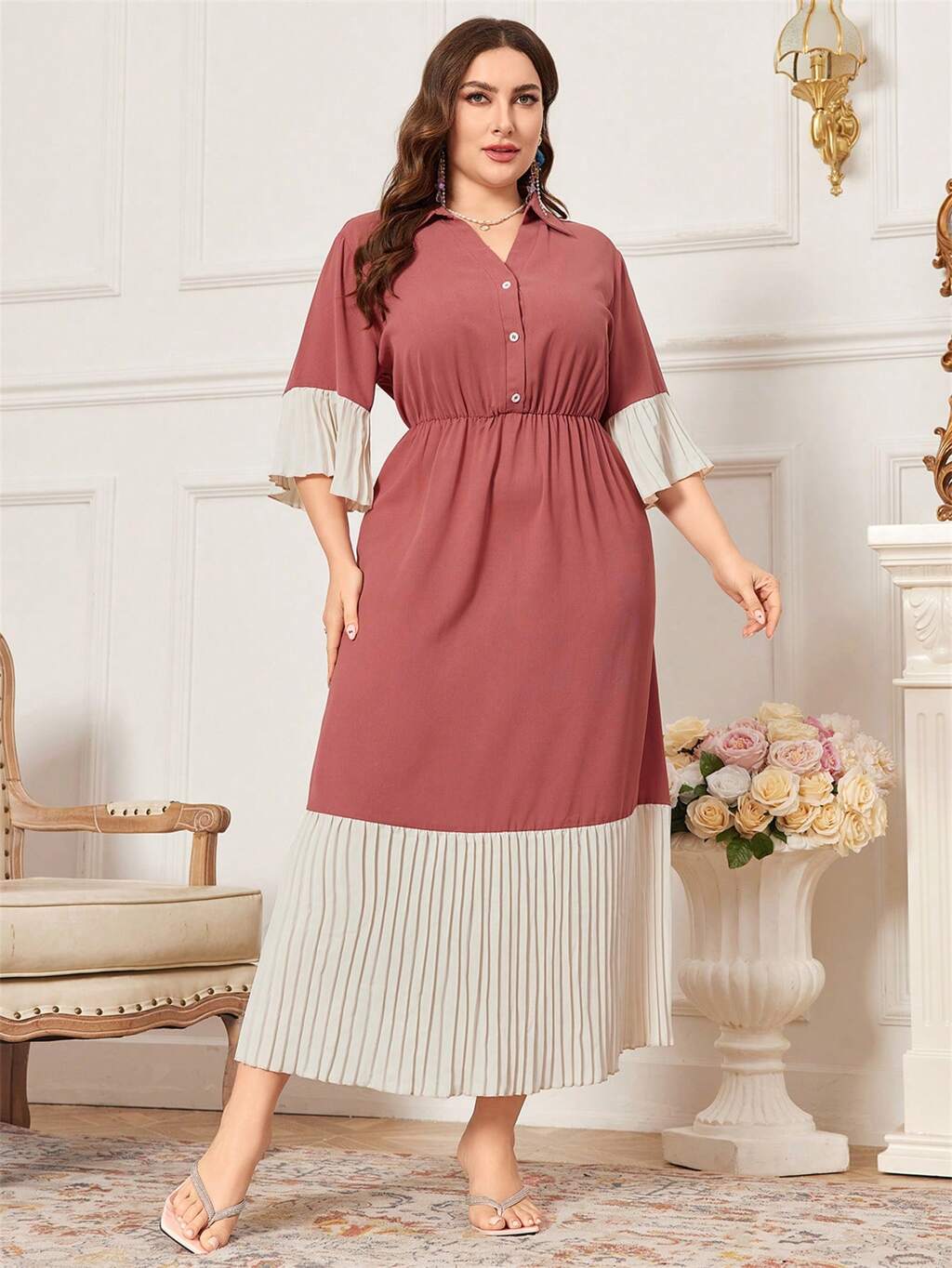 Plus Size Women's Contrast Color Pleated Hem Dress