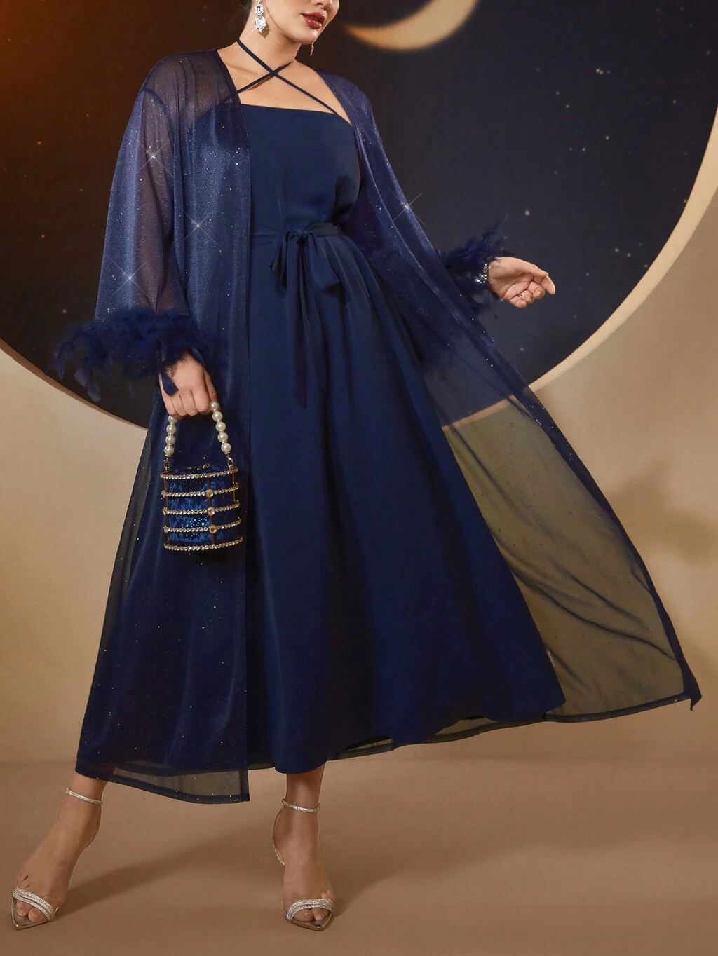 Plus Size Women's Glitter Sparkle Jacket And Halter Neck Dress Set, Patchwork Turkey Feather & Real Fur 2 Piece Set