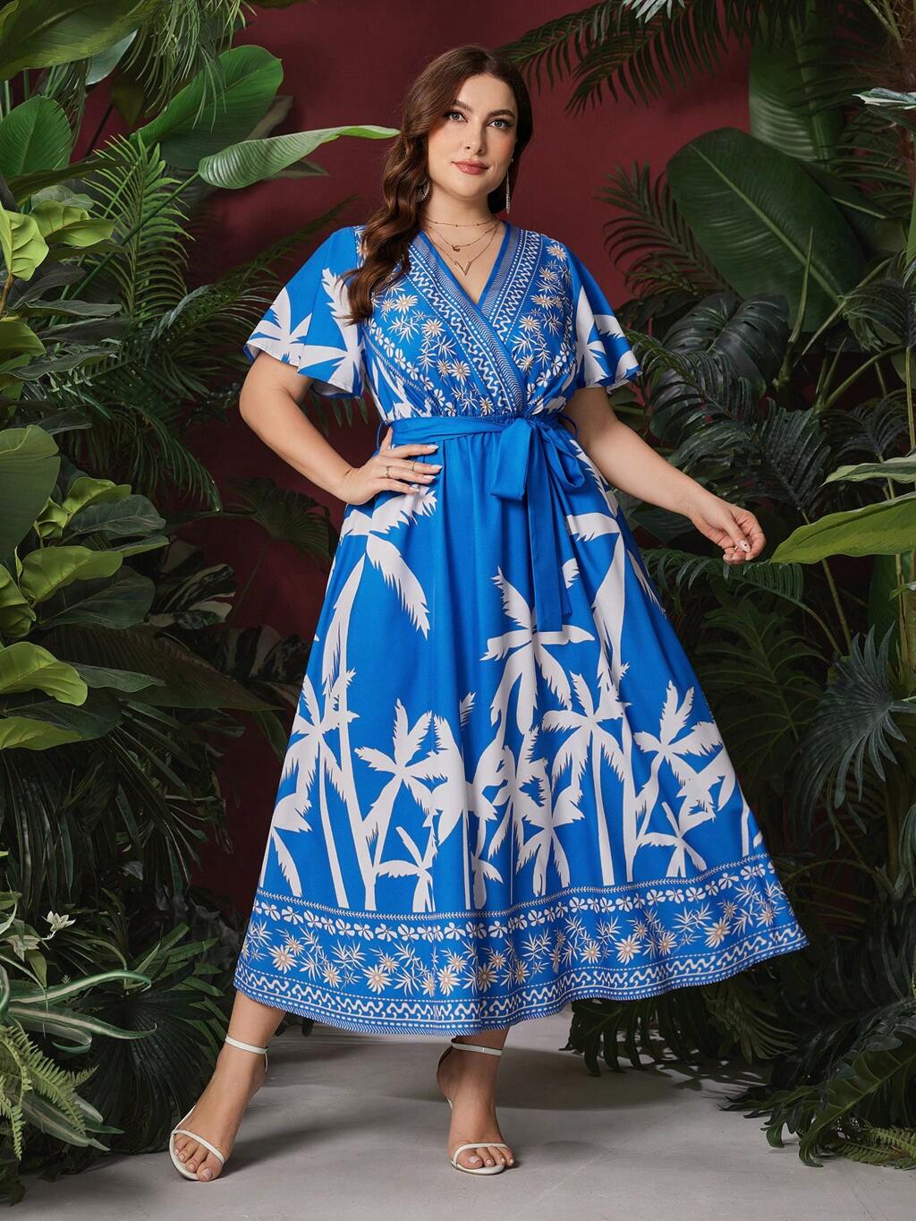 Plus Size Women's Palm Tree Printed Ruffle Short Sleeve Dress