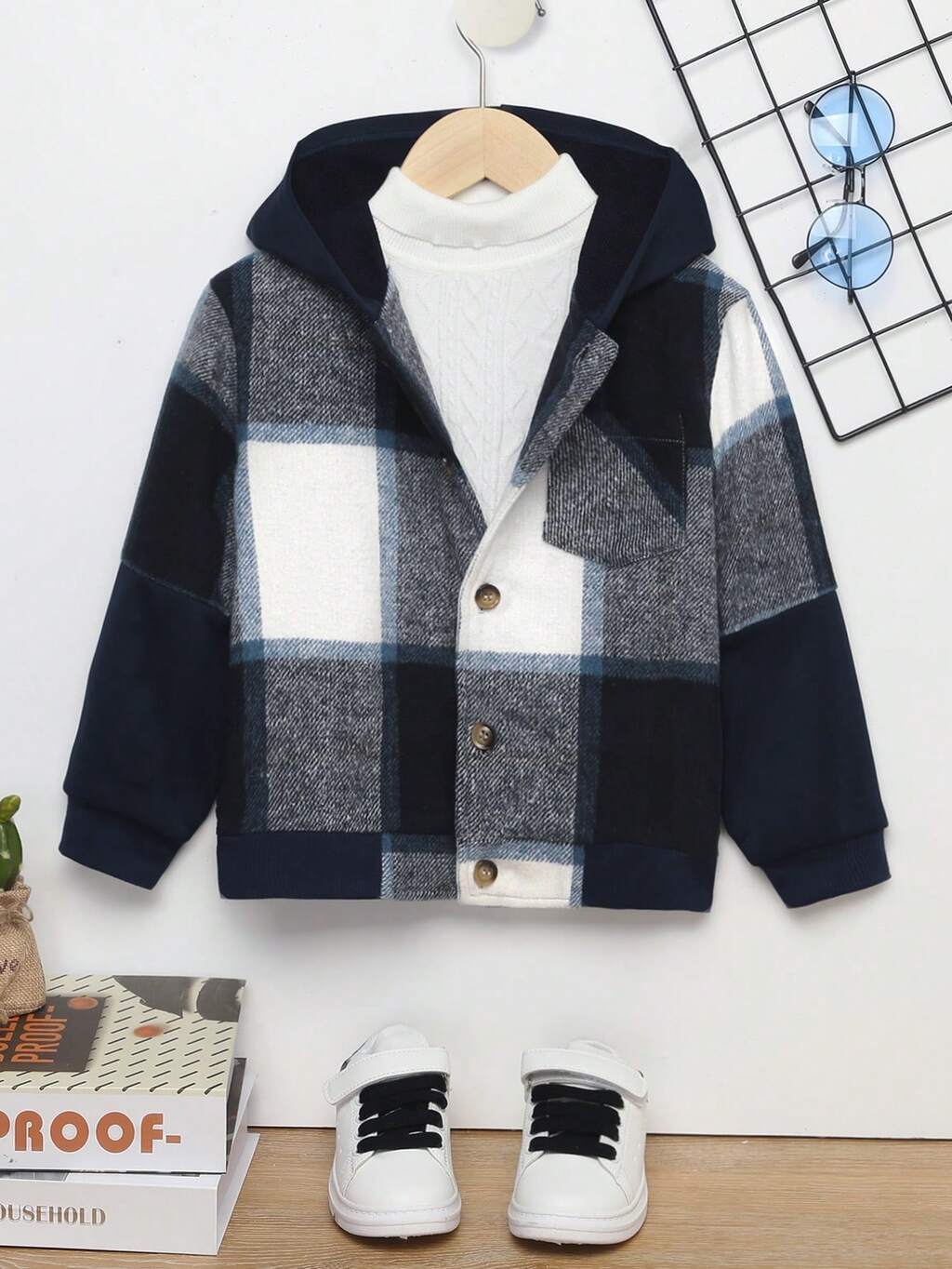 Young Boy Plaid Print Hooded Overcoat
