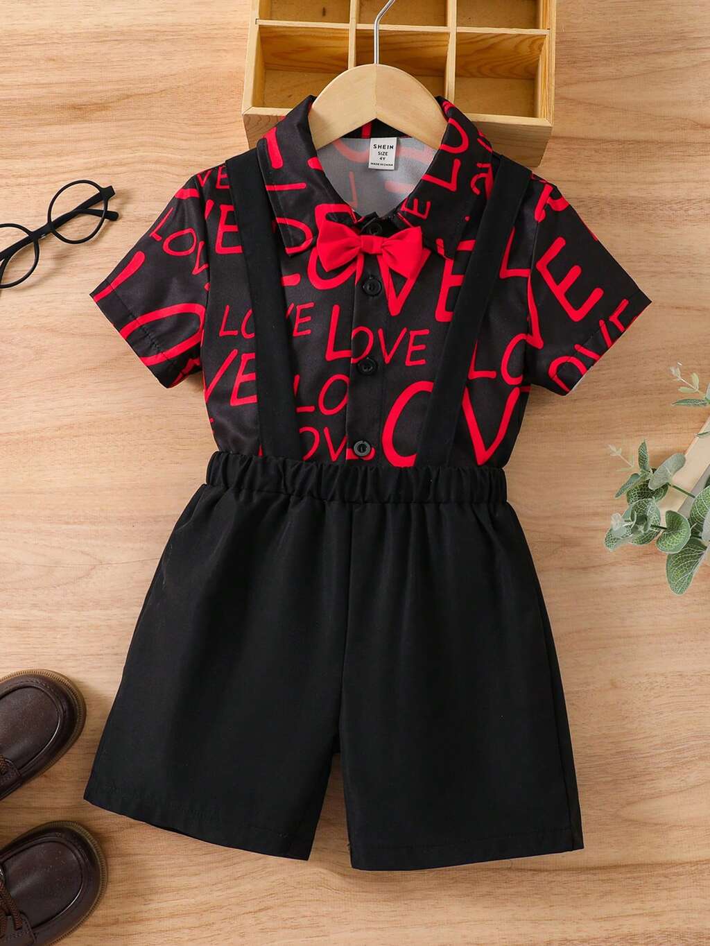 Toddler Boys' Letter Printed Shirt With Bowknot And Suspenders Shorts Set