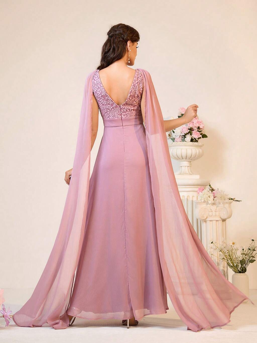 Women Romantic And Elegant Pink Purple Lace Fabric Spliced With Chiffon Fabric, Deep V-Neck, A-Line Sleeves, Ethereal Long Sleeves, Flowy Drapes, V-Shaped Back With Sequins, Bridesmaid Dress