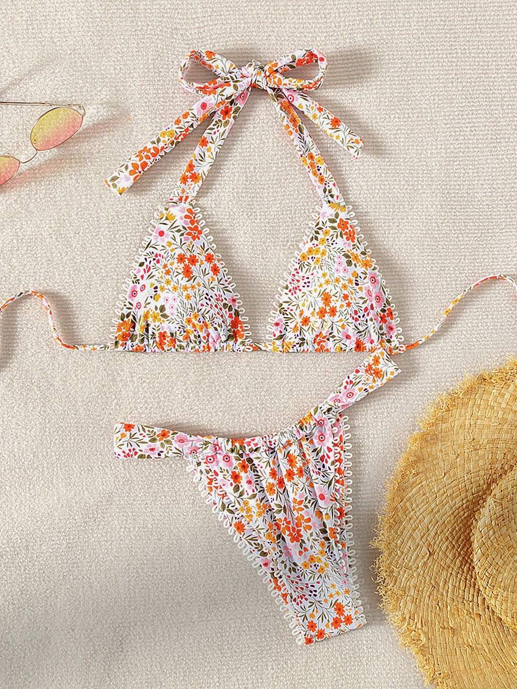 Women's Ditsy Floral Halter Neck Tie Sexy Bikini Set For Vacation, Vacation Bikini Set Summer Beach