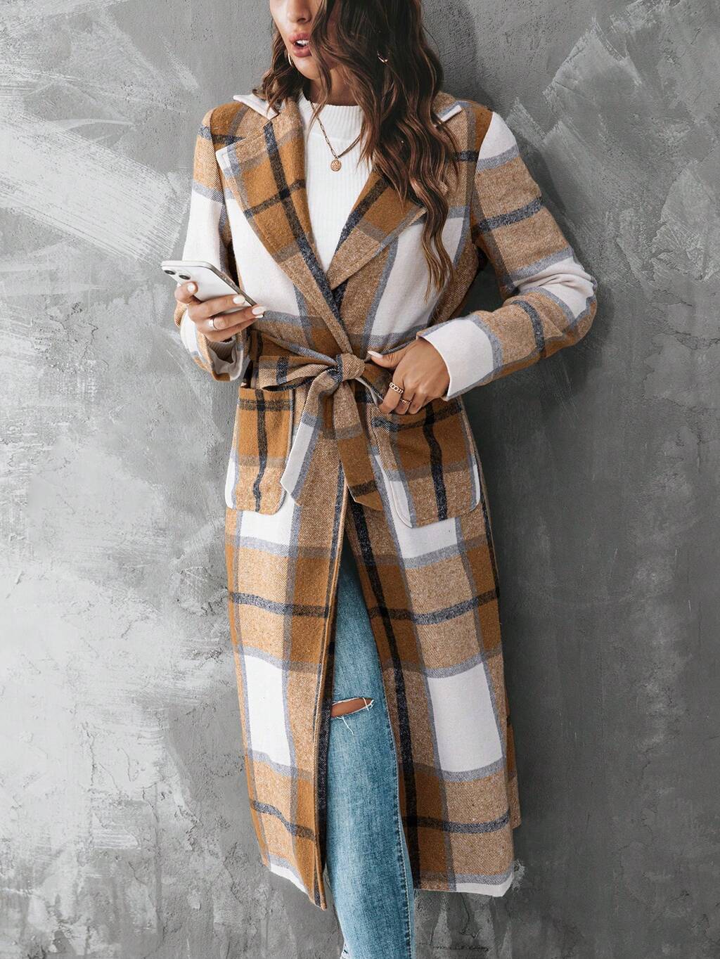 Plaid Print Double Breasted Overcoat Without Belt Fall Cloth For Women