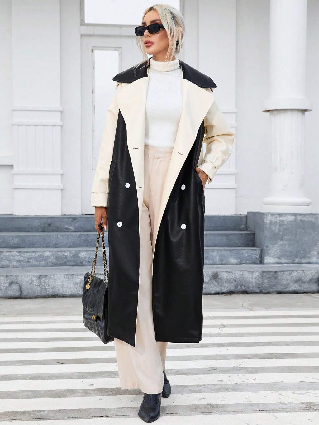 Two Tone Double Breasted Belted Trench Coat
